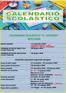 Il calendario scolastico 2025/26, con le indicazioni delle festività e dei giorni di sospensione definiti dallo Stato, dalla Regione e dall’Istituzione scolastica, è reperibile al SEGUENTE INDIRIZZO